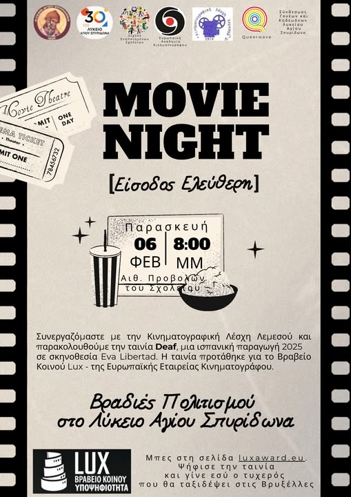 Αρχή κάνουμε με την εκδήλωση «Κινηματογράφος στο Σχολείο» (movie night), μια εκδήλωση που εισηγήθηκε και σχεδίασε το Κεντρικό Μαθητικό Συμβούλιο του Σχολείου. Σε συνεργασία με τον Ντιέκο Αρμάντο, την Κινηματογραφική Λέσχη Λεμεσού και τον Σύνδεσμο Γονέων του Σχολείου μας, θα γίνει η προβολή της ταινίας DEAF, μιας ισπανικής παραγωγής 2025, σε σκηνοθεσία Eva Libertad. την Παρασκευή 6 Φεβρουαρίου 2026, στις 8:00μμ. Η ταινία προτάθηκε για το Βραβείο Κοινού LUX της Ευρωπαϊκής Ακαδημίας Κινηματογράφου στο πλαίσιο του φεστιβάλ Creative Europe Media.