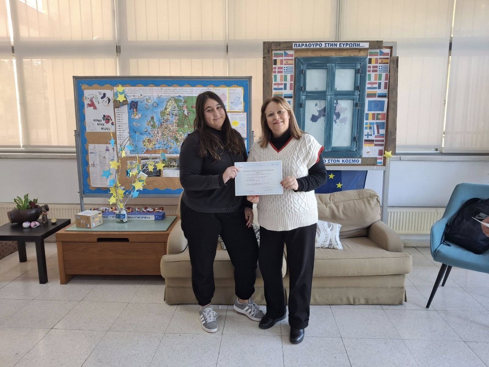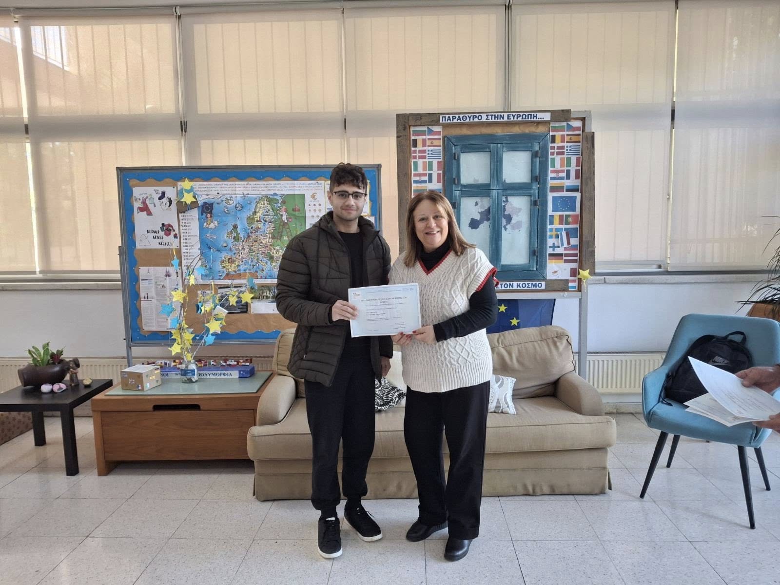 DELF είναι η πιστοποίηση της γνώσης της γαλλικής γλώσσας στα διάφορα επίπεδα της. Τέσσερα παιδιά της Γ Λυκείου εμπλούτισαν το πορτοφόλιο τους με ένα επιπλέον δίπλωμα DELF. Με ιδιαίτερη χαρά η Διευθύντριά μας και ο διδάσκων καθηγητής, Γιώργος Παπαδόπουλος απένειμαν τα διπλώματα στα παιδιά! Συγχαρητήρια στον Αριστείδου Χρίστο (Γ31), στην Καραγιάννη Ελένη (Γ32), στον Μάρσιπ Κρίστοφερ Γιοσεφ (Γ32) και στη Χαρίλαου Αναστασία (Γ41).