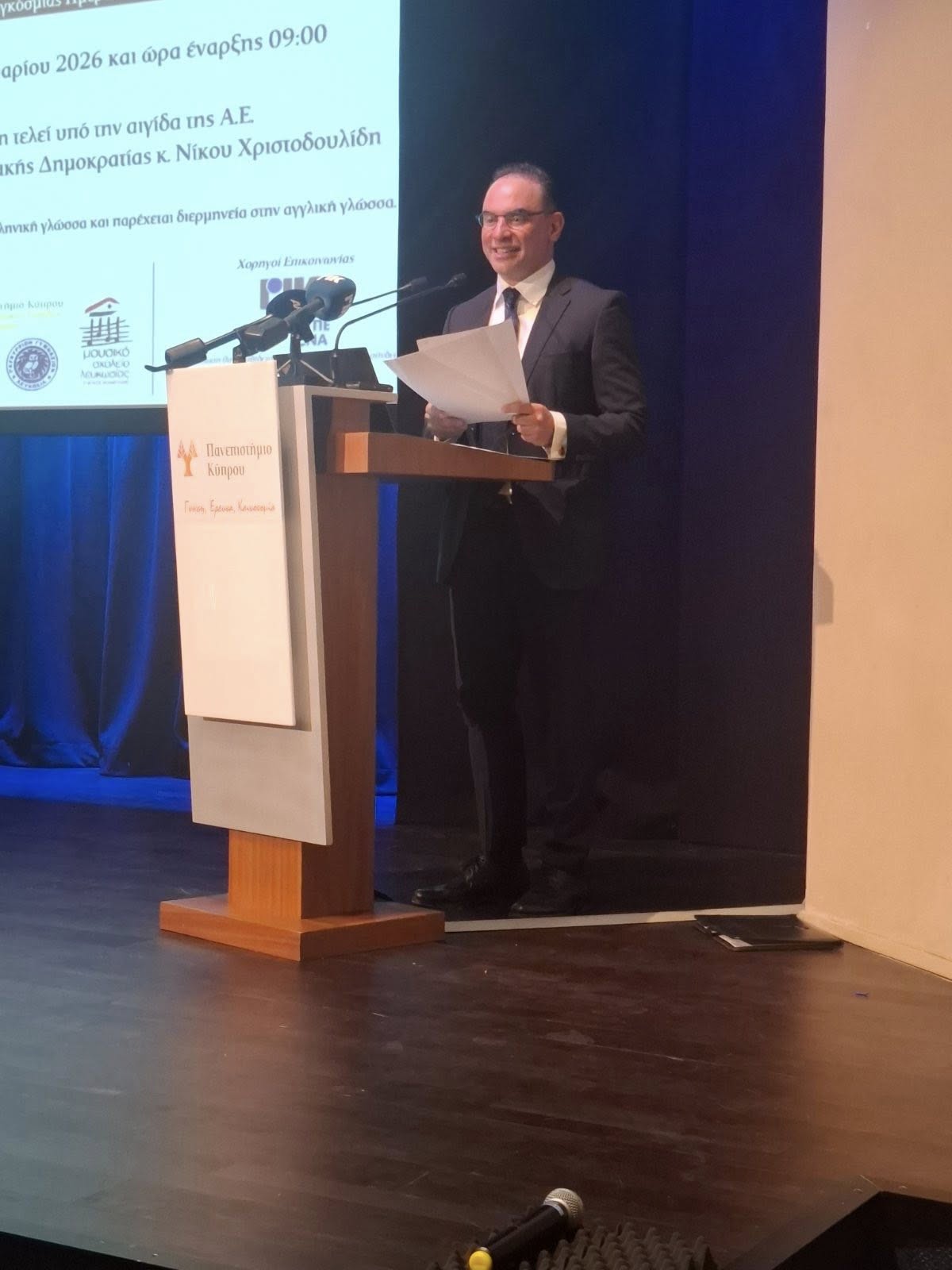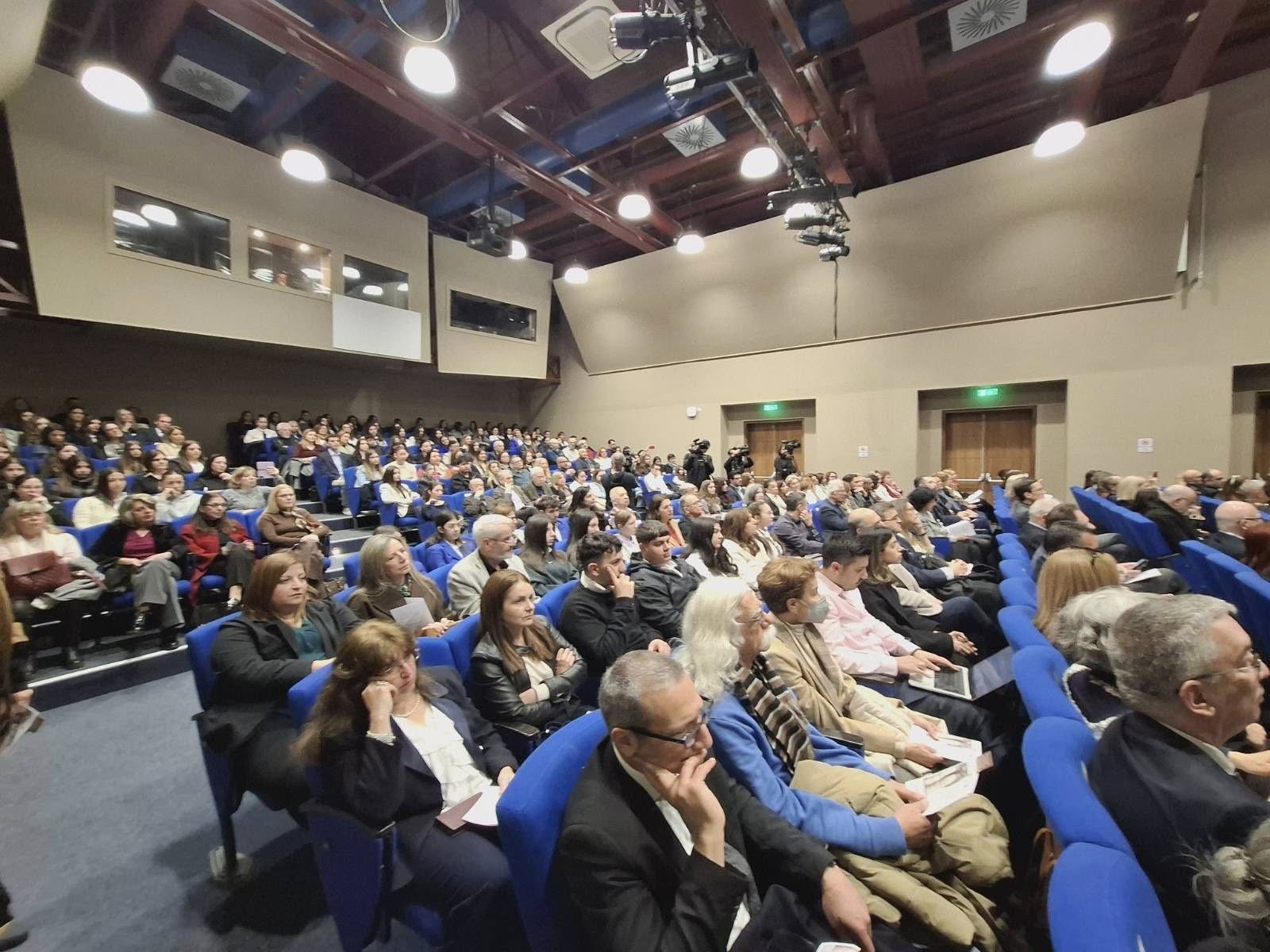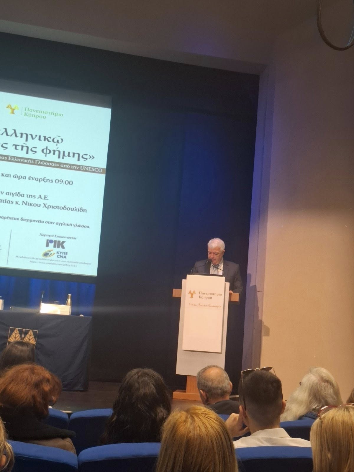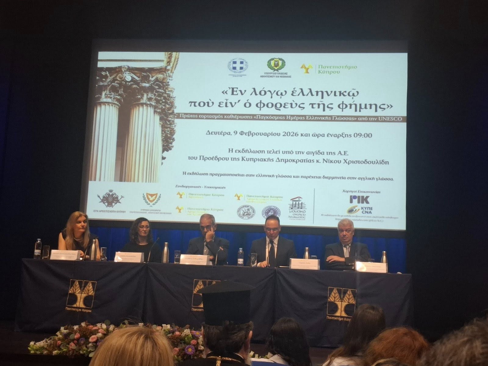 «Ἐν λόγῳ ἑλληνικῷ ποὺ εἶν’ ὁ φορεὺς τῆς φήμης» ήταν η μεγάλη εκδήλωση για τον εορτασμό της ελληνικής γλώσσας που συνδιοργάνωσε το Υπουργείο Παιδείας, το Πανεπιστήμιο Κύπρου, και η Πρεσβεία της Ελλάδος στη Λευκωσία. Διαλέξεις από διακεκριμένους επιστήμονες, μουσική παρέμβαση από μαθητές του Μουσικού Σχολείου Παγκυπρίου Γυμνασίου και έκθεση παλαιτύπων ανέδειξαν τη βαθιά επίδραση της ελληνικής γλώσσας στη Δυτική Ευρώπη. Το Σχολείο μας εκπροσωπήθηκε στην εκδήλωση με τη φιλόλογο Έλενα Κουάλη.